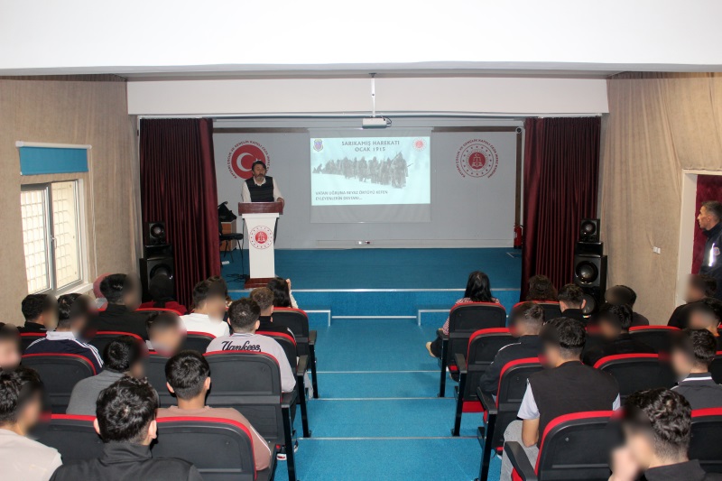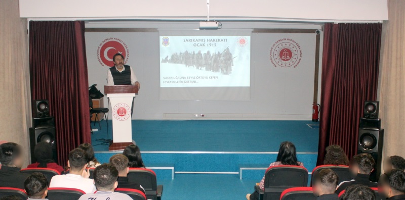Kars’ın Sarıkamış ilçesi Allahu Ekber dağlarında vatanı işgal etmek isteyen Rus İmparatorluğu askerlerine göğsünü siper ederek üstün bir cesaret örneği göstererek buz tutan bedenleriyle düşman kurşunundan daha çok kayıp verdiğimiz Sarıkamış’ta, tereddüt etmeden son nefeslerine kadar mücadele eden şehitlerimizi rahmet, gazilerimiz ise minnetle anıyoruz. Bu doğrultuda Kurum Başöğretmeni Yılmaz SARIVAZ tarafından günün anlam ve önemini belirten seminer gerçekleştirilmiştir. Akabinde ise Sarıkamış konulu sinevizyon gösterisi gerçekleştirilmiş ve suça sürüklenen çocuklara şehitlerimizin aziz hatıralarına sahip çıkmalarıyla ilgili farkındalık çalışması yapılmıştır.